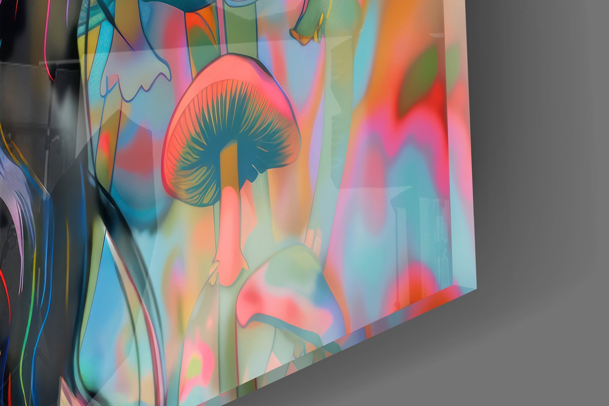 Experience the surreal beauty of a forest under the influence of vibrant mushrooms and a mysterious woman in this premium tempered glass wall art.