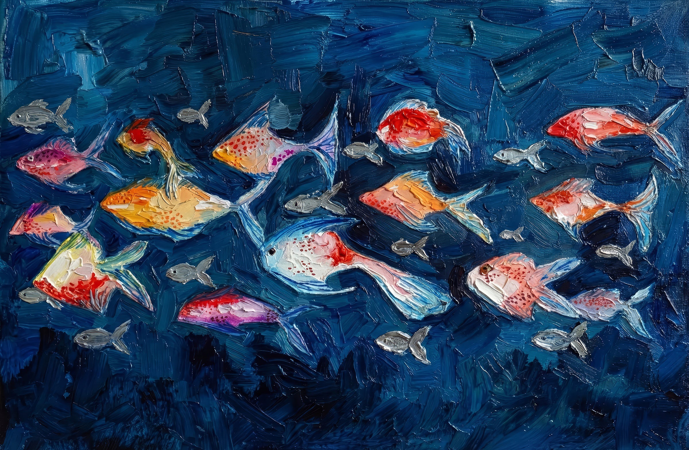 | Texture | Raised Surface (Heavy impasto texture on fish and water currents) |