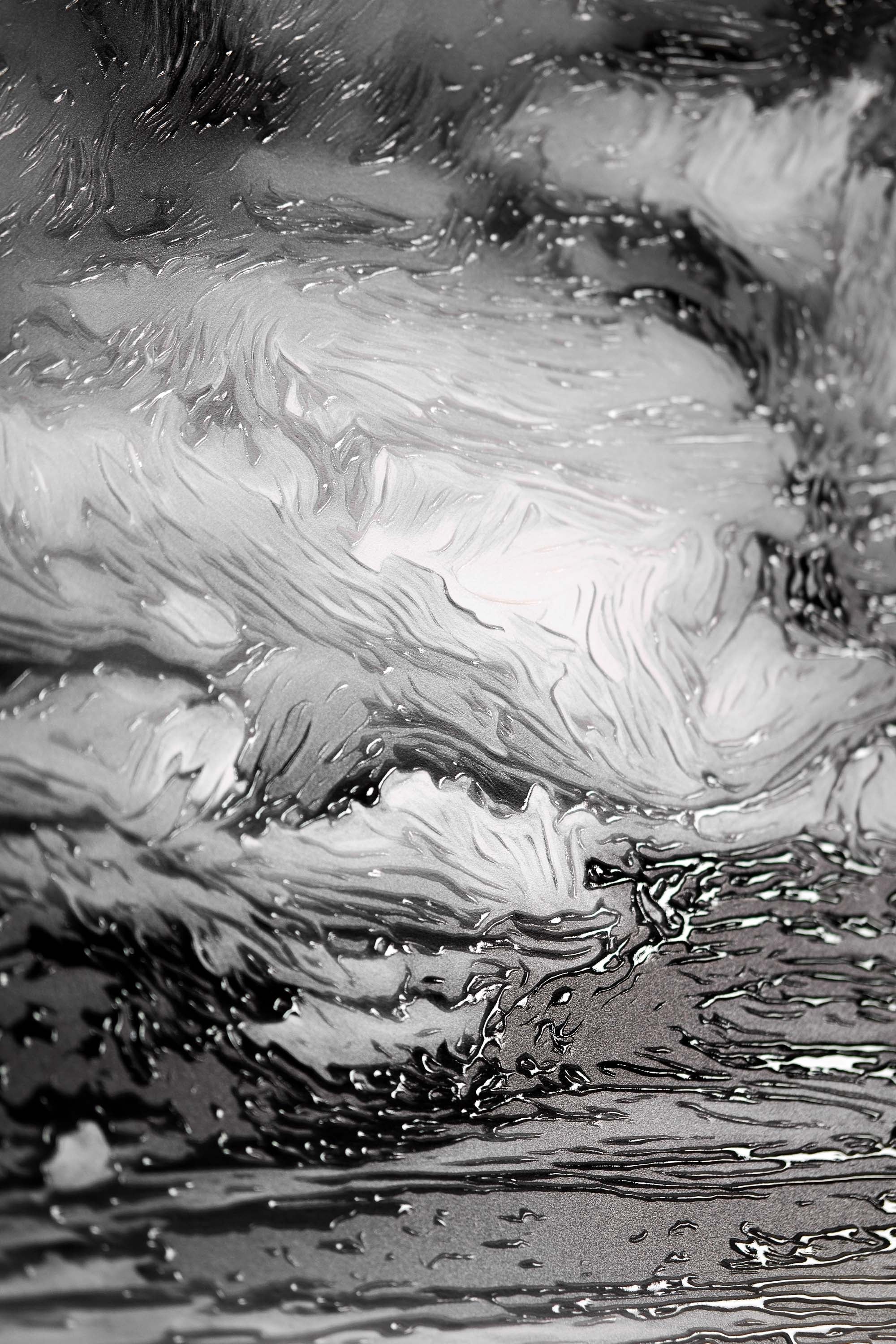 - Sculpted Storm Sky: The swirling grey and black clouds are built up in layers, creating a heavy, atmospheric texture that physically emerges from the industrial aluminum base.