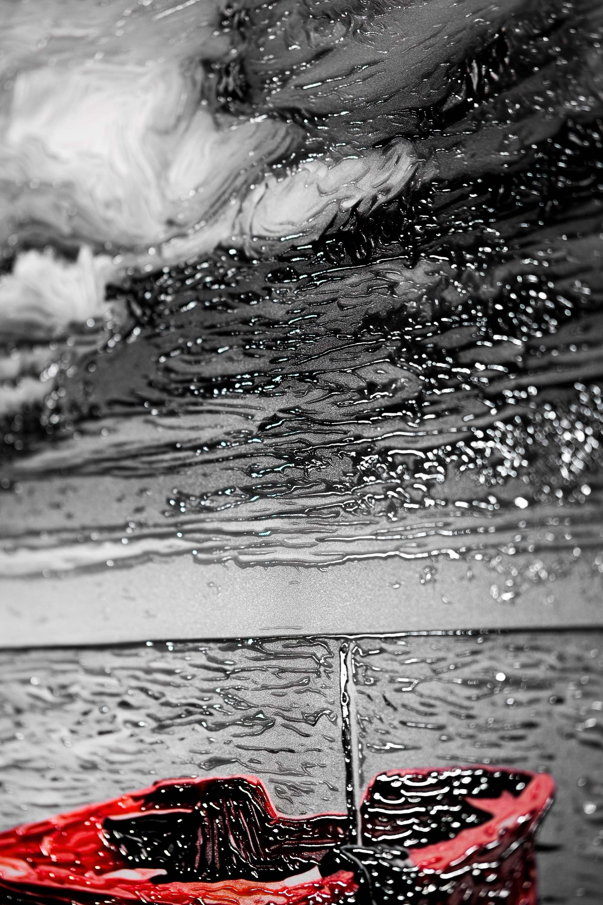 - Raised Crimson Hull: The red boat is rendered in high relief, featuring thick physical ridges that mimic layers of peeling, weathered paint on an old vessel, making it stand out as a three-dimensional object.