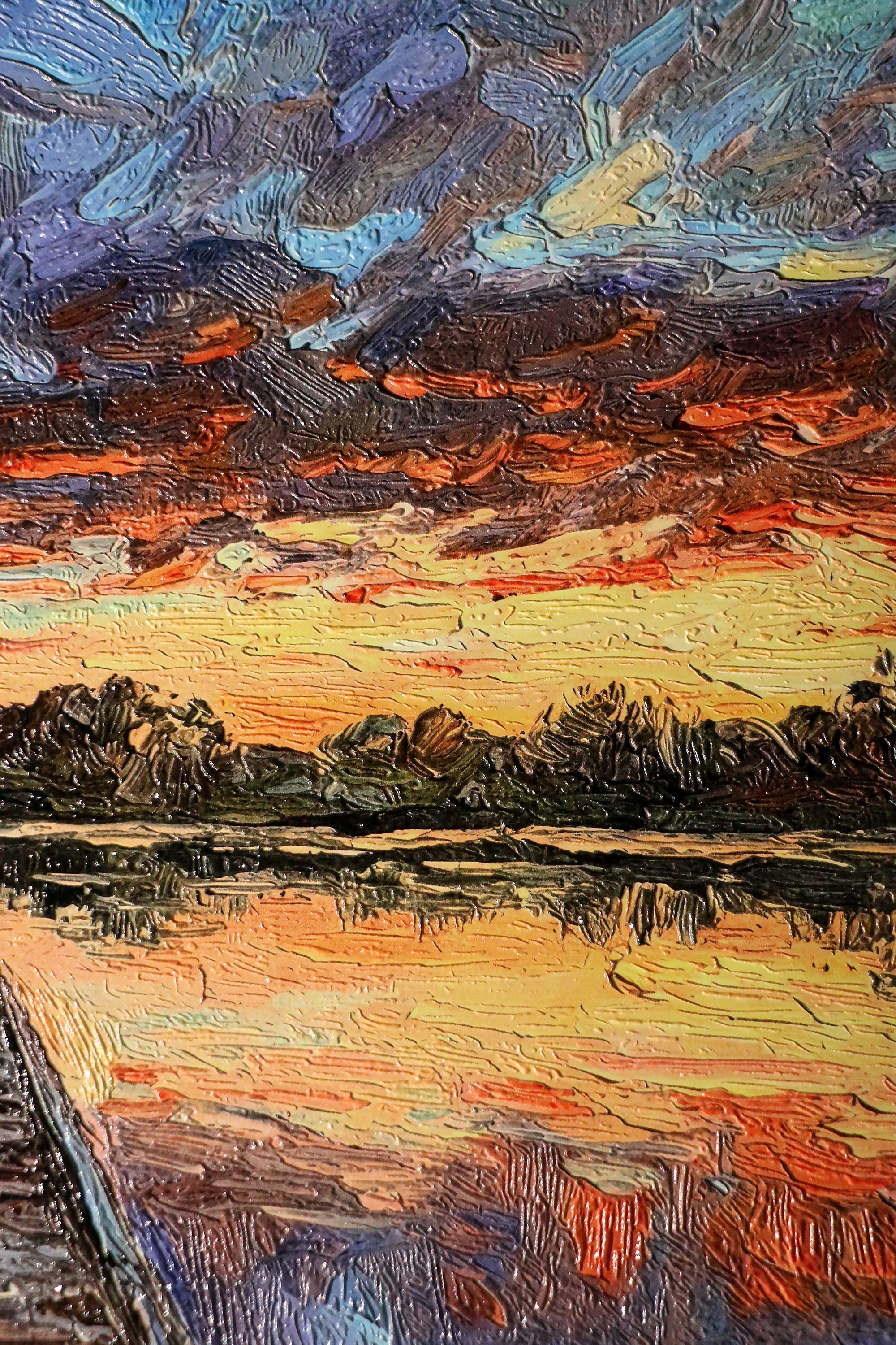 Not just a landscape—a textured pathway into a painted sunset. Twilight Pier Reflections captures a serene wooden dock leading into a lake where the fiery horizon meets the deep blue sky. Utilizing our proprietary 3D haptic embossing, the heavy, swirling impasto brushstrokes are transformed into a tangible relief, making the journey to the horizon something you can feel as well as see.