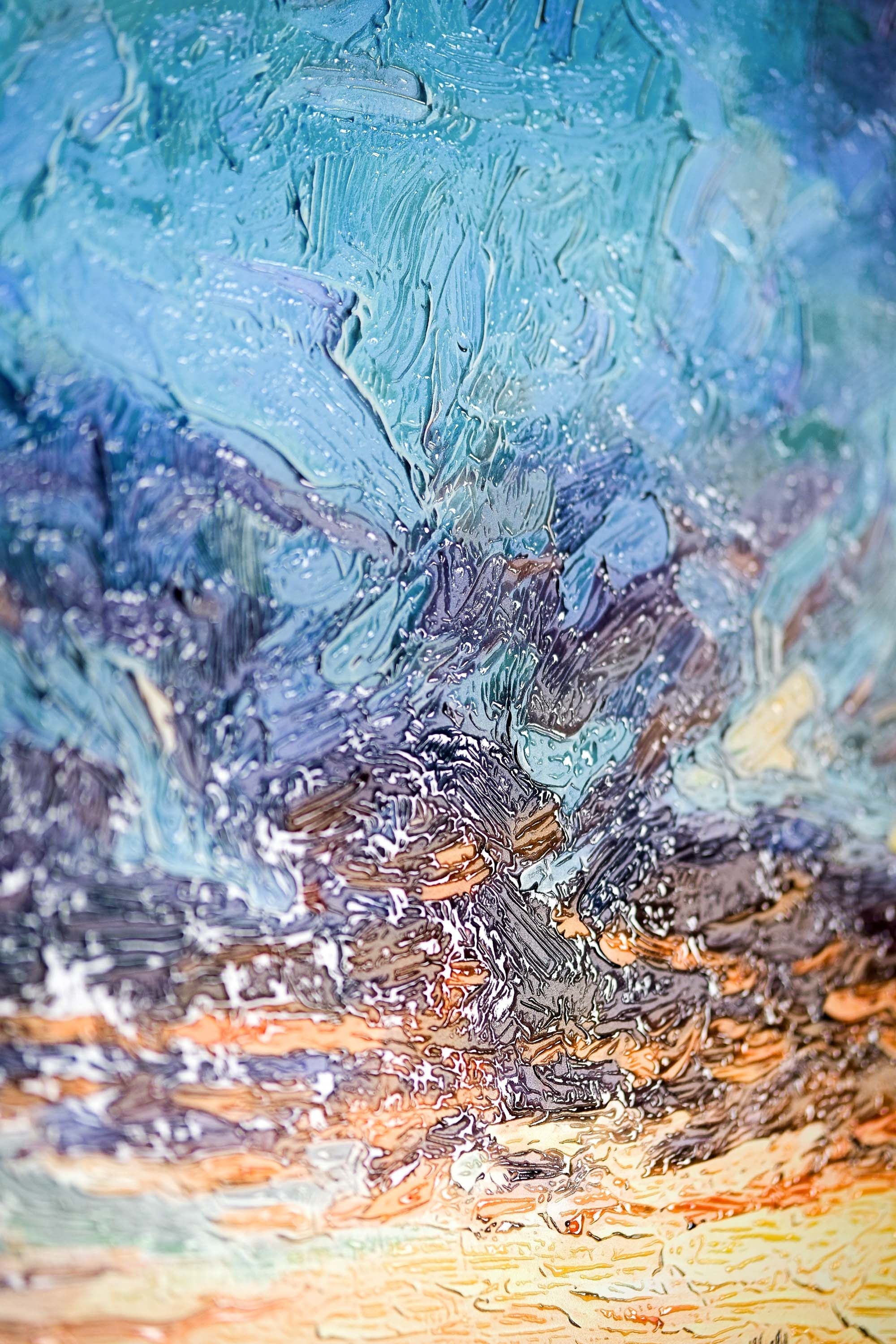 Our multi-layer embossing technology replicates the sculptural application of thick oil paint. The surface is a landscape of its own, with physical peaks and valleys that bring the artist's vision to life on a modern aluminum base.