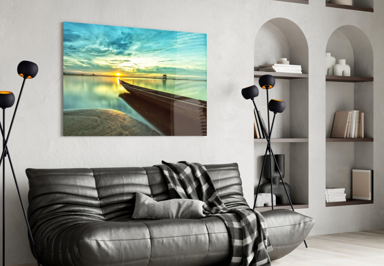 Arte de pared de vidrio de Kayak en la playa y puesta de sol