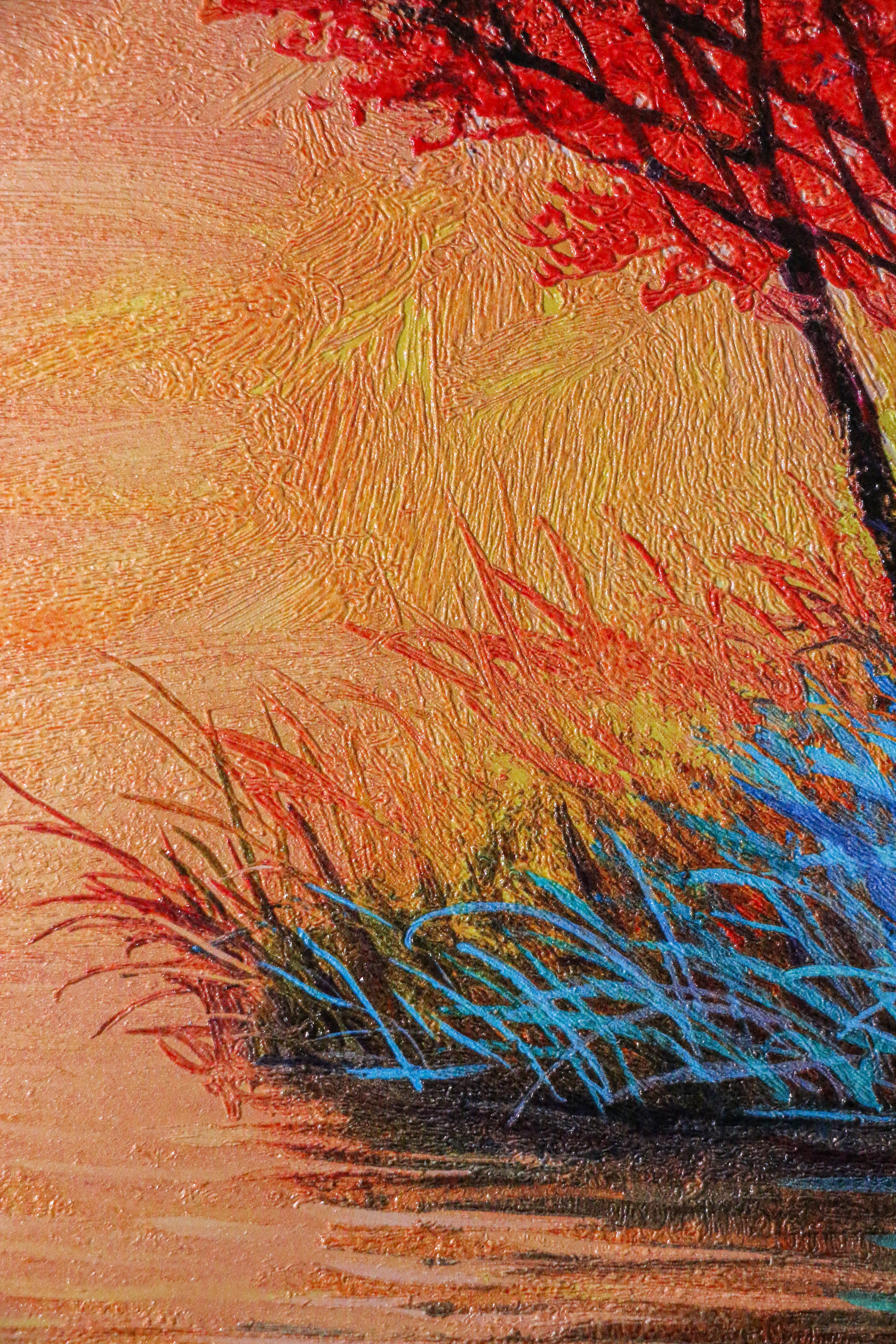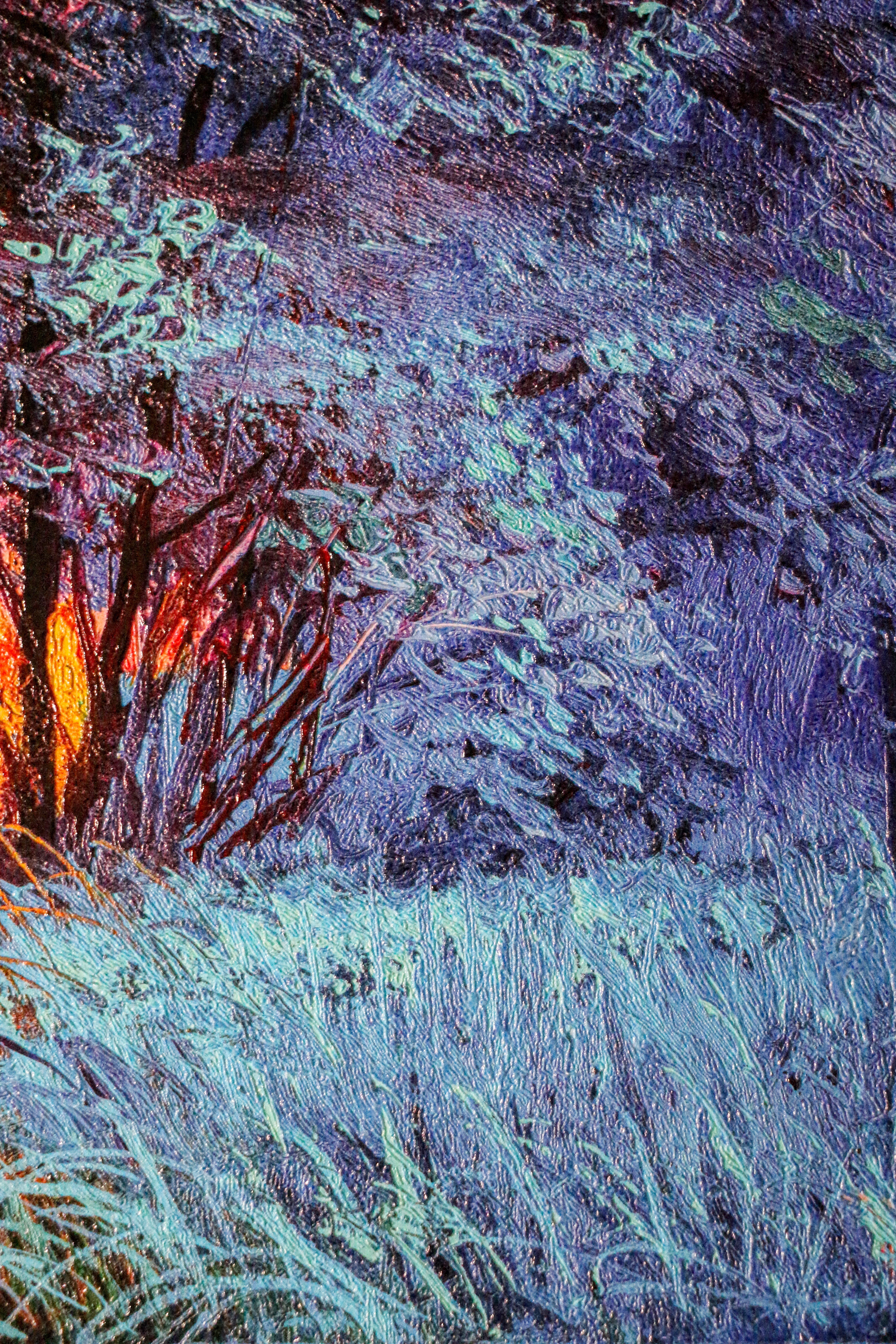 Our multi-layer embossing technology replicates the heavy, palette-knife application of the original impasto style. The surface is sculpted to follow the chaotic yet rhythmic build-up of the leaves and the marshy grass below, giving the artwork a tangible gallery presence.
