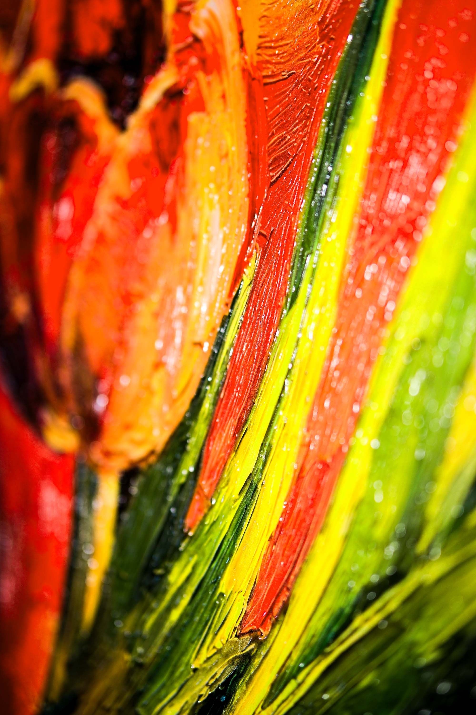 Selective high-gloss lacquer is applied to key accents—petal edges, highlights, and focal color peaks—to intensify contrast and richness. Under changing light, the lacquer activates with a refined sheen, making the reds feel deeper and more vibrant.