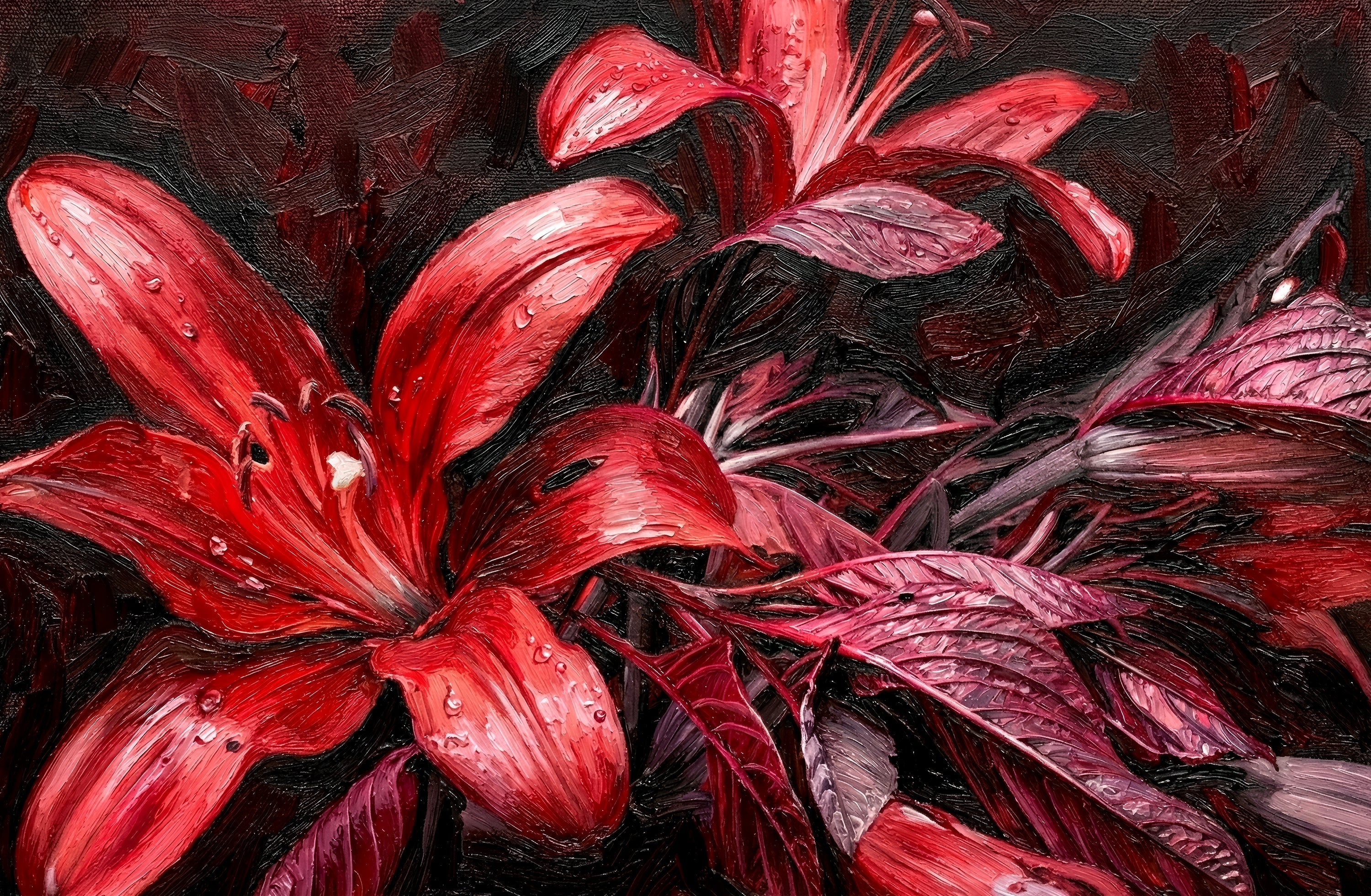 Crimson Velvet Lilies — 3D Haptic Embossed High-Gloss Luxury Wall Art