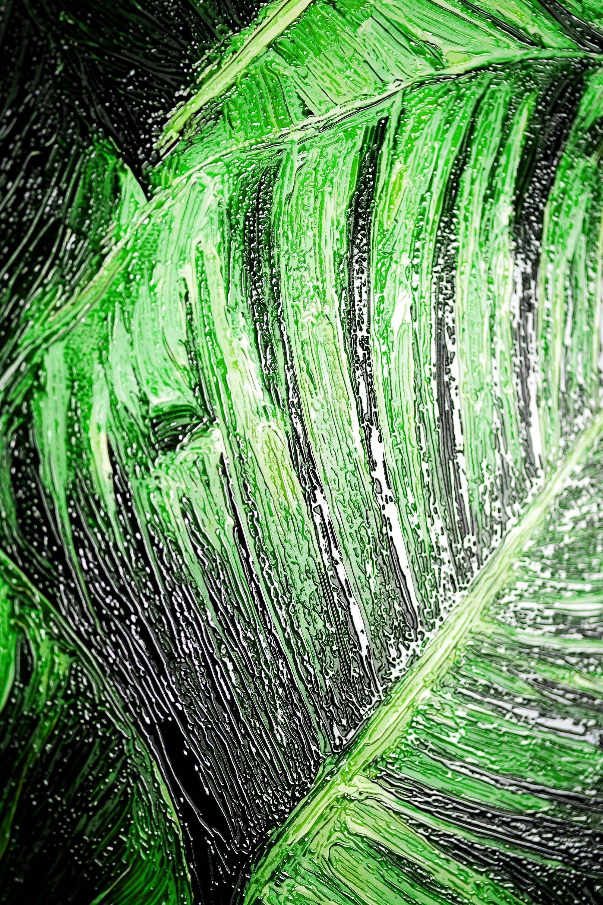 A deep immersion into the lush, rhythmic heart of nature. Verdant Tropics Infusion captures the layered majesty of tropical foliage, featuring broad, vibrant green leaves that overlap in a dense, energetic composition. Utilizing our proprietary 3D haptic embossing on a premium aluminum panel, the thick, sculptural brushstrokes and the intricate architecture of the leaf veins are transformed into a tangible relief that radiates life and freshness.